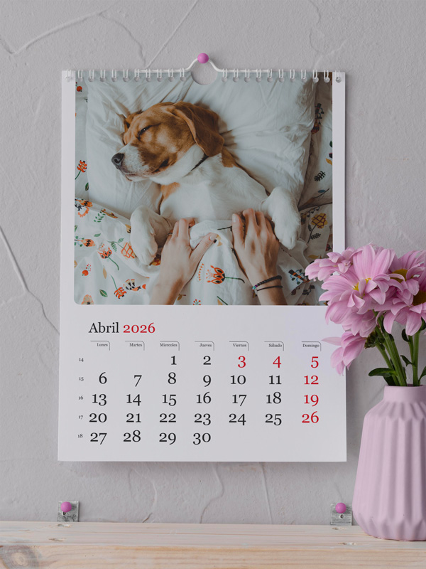 Calendario de pared personalizado en tamaño A4 (21 × 29,7 cm), con 12 hojas mensuales impresas a todo color sobre cartulina de 300 g.