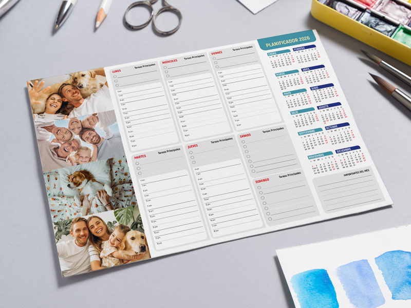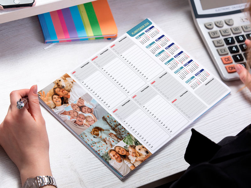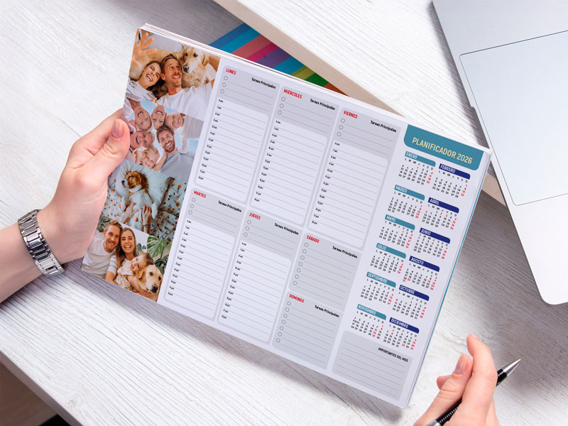 Su formato amplio y ligero te permite escribir cómodamente sobre cada casilla del mes, mientras que la cabecera puede personalizarse con tus fotos, ilustraciones o diseños.